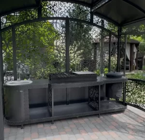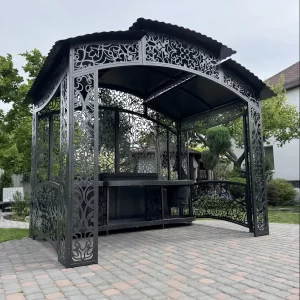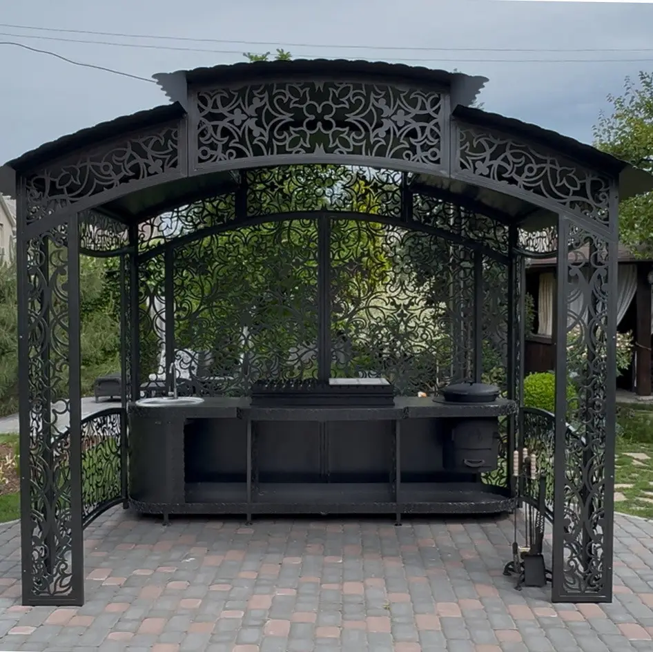 Išskirtinė metalinė pavėsinė , sukurta ne tik dėl grožio, bet ir dėl komforto. Dviejų lygių konstrukcija harmoningai įsilieja į kraštovaizdį ir tuo pačiu metu tarnauja kaip apsauga nuo kaitrios saulės ir netikėto lietaus. Jūs gaminate maistą – ir jokie orai nesutrukdys šiai nedidelei šventei. Čia kiekviena linija, kiekvienas kampelis – tai dizaino sprendimas, apgalvotas iki smulkiausių detalių.